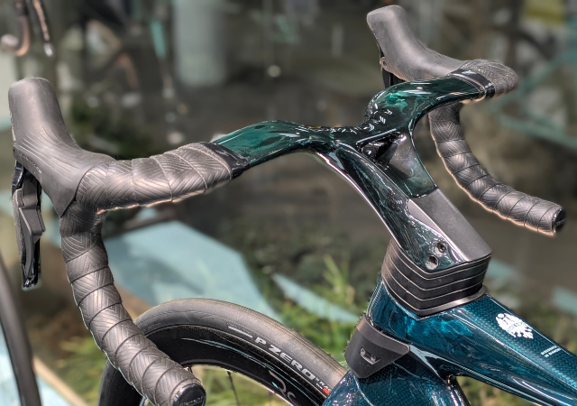 カーボンモノコックフレームで、剛性と軽量性を両立。内装ケーブルルーティングにより、空気抵抗を削減し、見た目もすっきりしています。