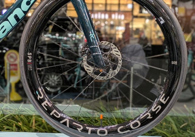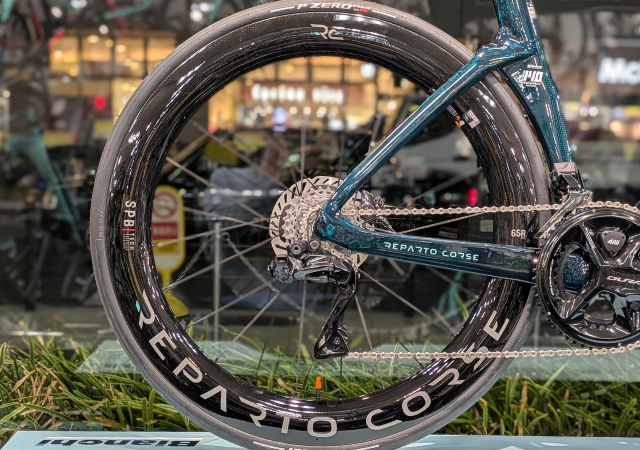 Reparto Corseのカーボンホイールを装備。前後異形リムで、軽量かつ高いグリップ性能を実現。